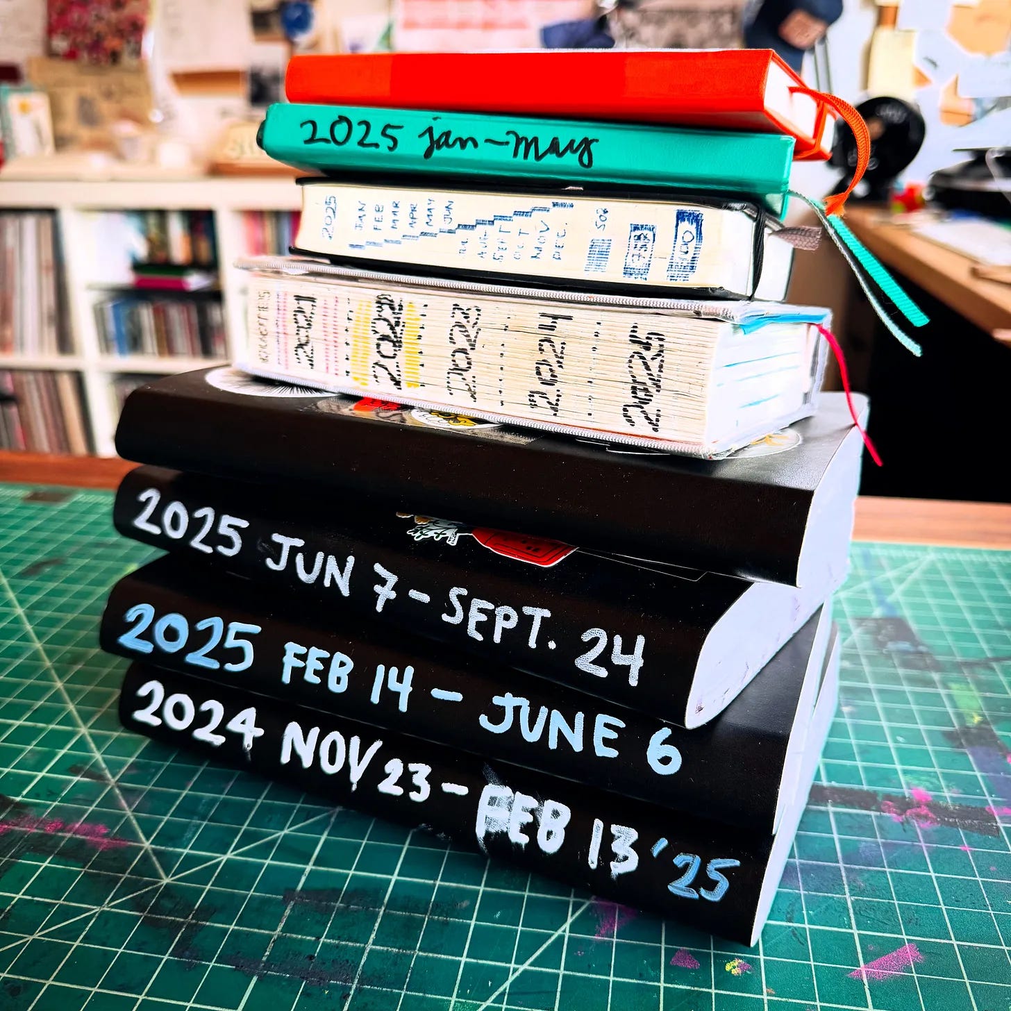 Keeping old diaries and logbooks in 5-year increments by my spot at the kitchen table, and if I have nothing to write about, dipping into them and doing a little time travel.