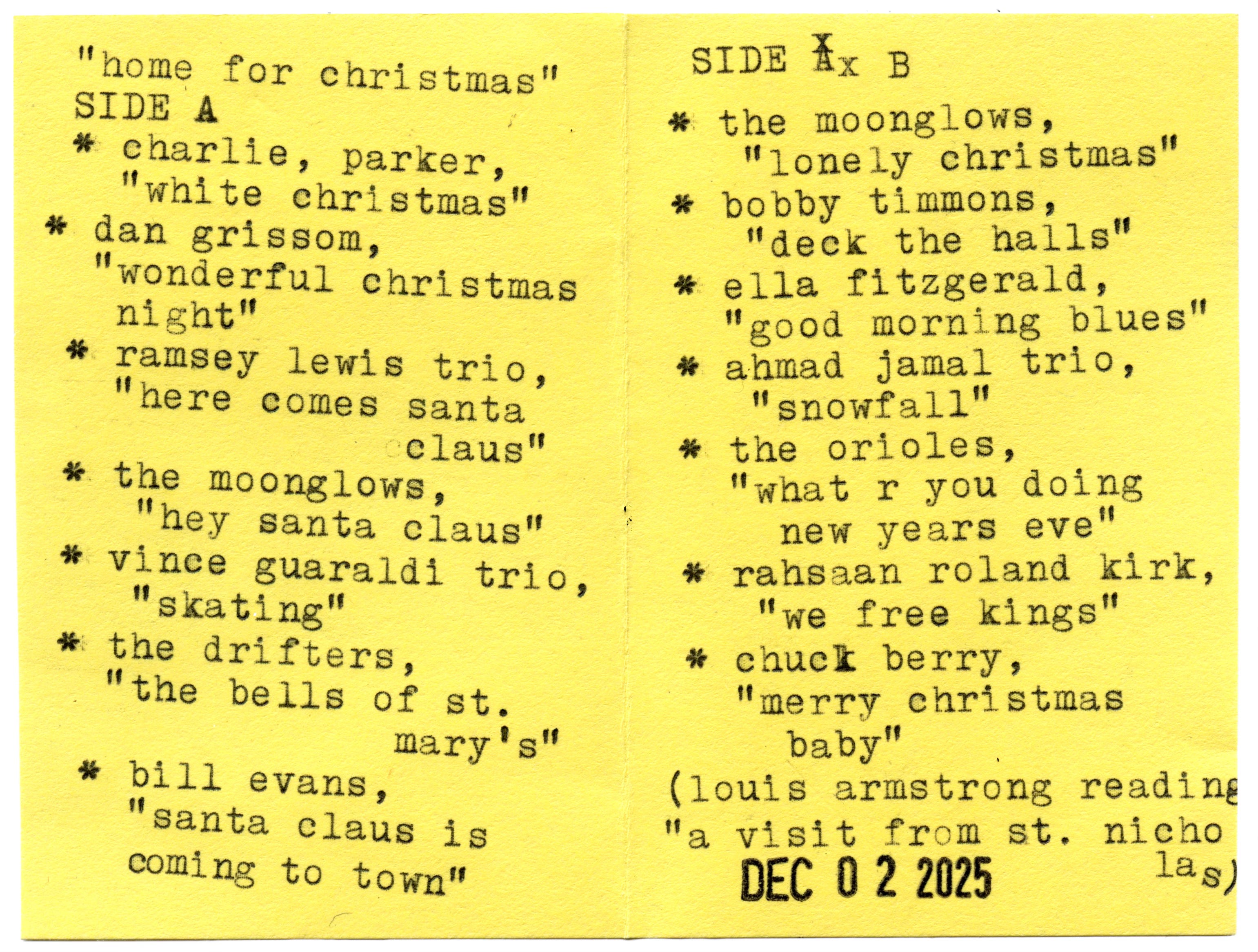 It’s very hard to fill a cassette perfectly, so I used snippets of Louis Armstrong’s reading of “A Visit from St. Nicholas” to plug up the gaps at the end of each side.