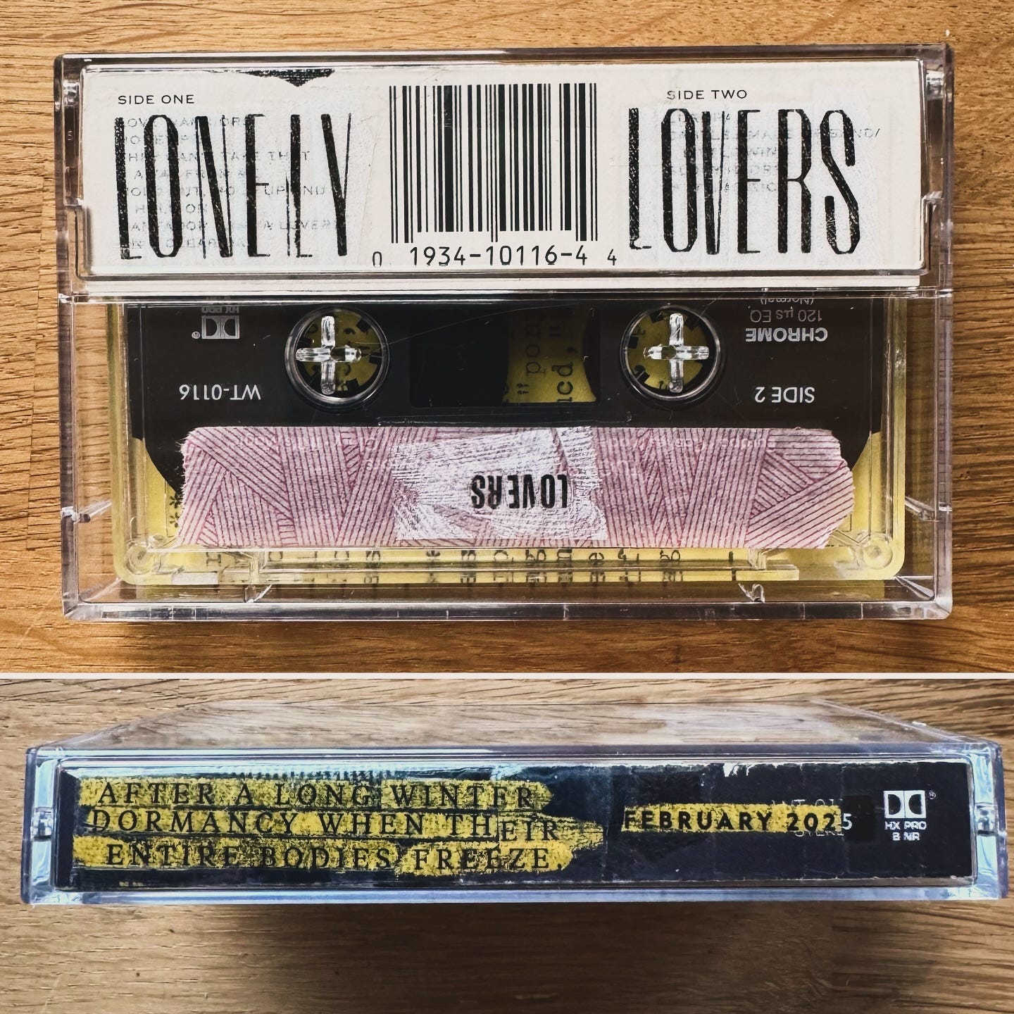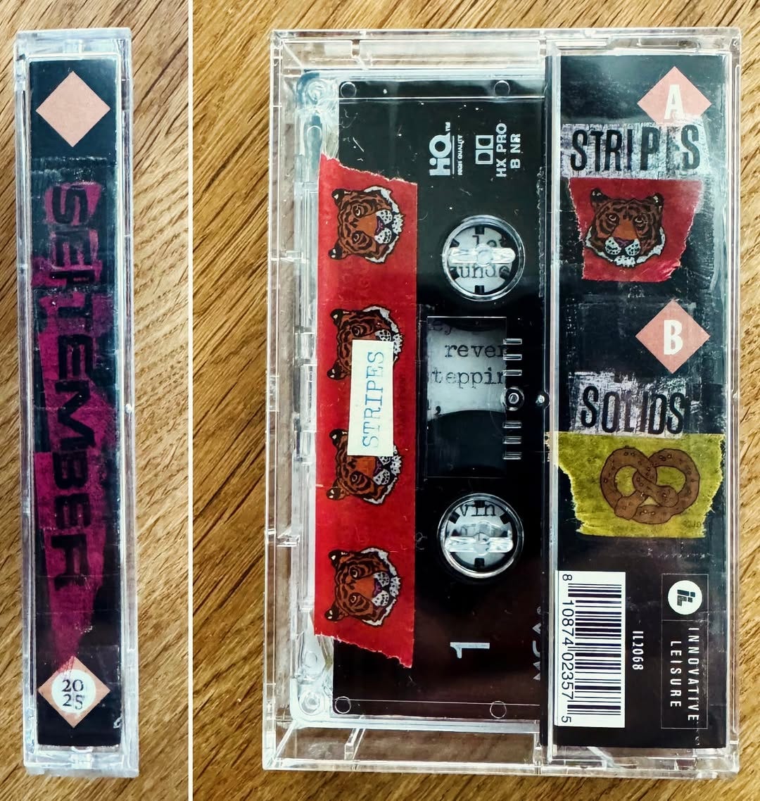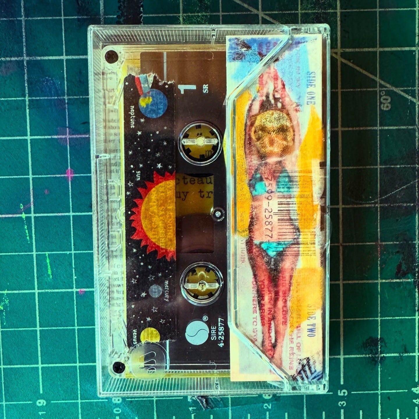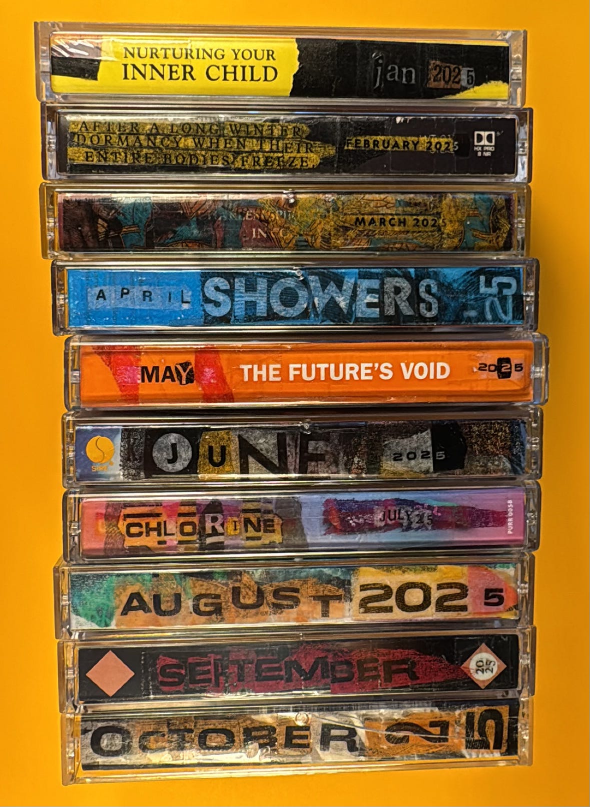 Every month, I take a pre-recorded cassette I got for 99 cents or less from the record store and I tape over it: first I tape over the recording protection tabs, then I tape over the music, then I tape over the tape covers.