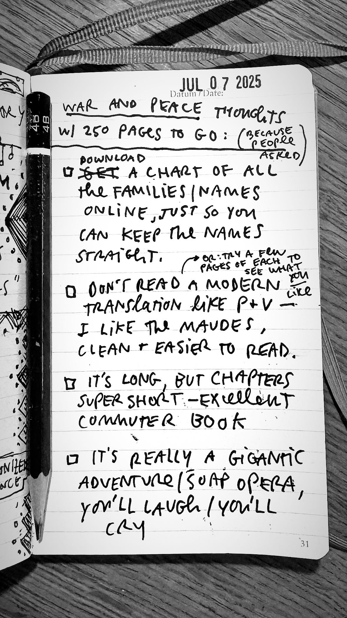 This summer’s big book is finished! War and Peace was awesome and weird and I loved it. A few folks asked me what translation I read. I started with Pevear and Volokhonsky, assuming a contemporary translation would be better than an old one, but boy, was I wrong! I found things way, way easier-going when I switched to the Aylmer and Louise Maude translation. (I plan on reading Anna Karenina this winter — I’ll either go with the Maudes or Constance Garnett, or try out Rosamund Bartlett’s translation.)