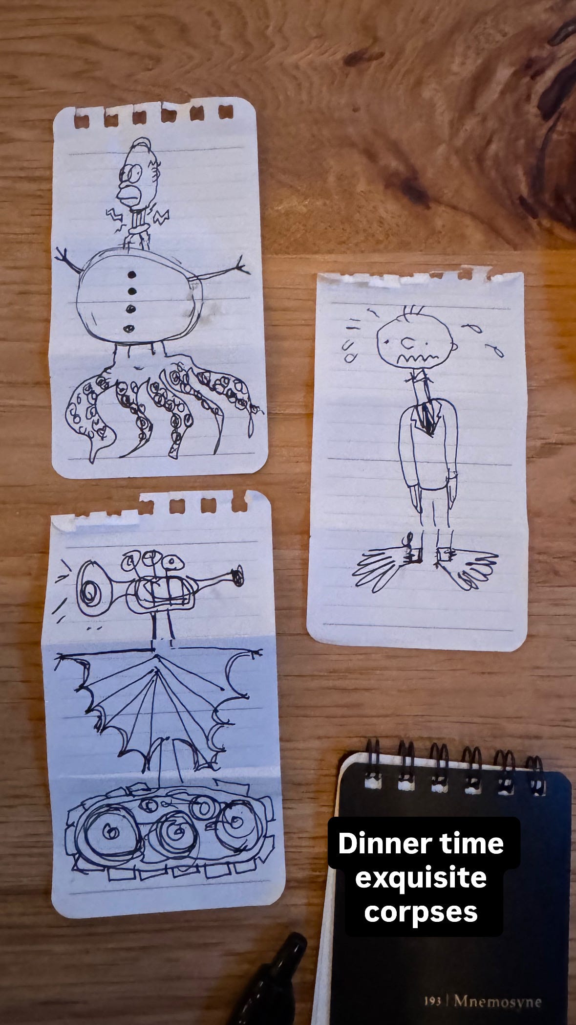 The full moon played tricks on us and we had bail on our previously planned Sunday dinner spot. It’s a special kind of torture waiting to be served at a mediocre restaurant with two hangry tweens. To pass the time, I pulled out my pocket notebook — I never leave home without it! — and we played a few rounds of exquisite corpse, a game invented by the Surrealists:
