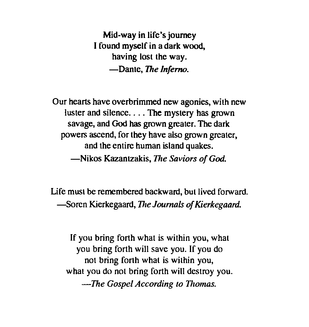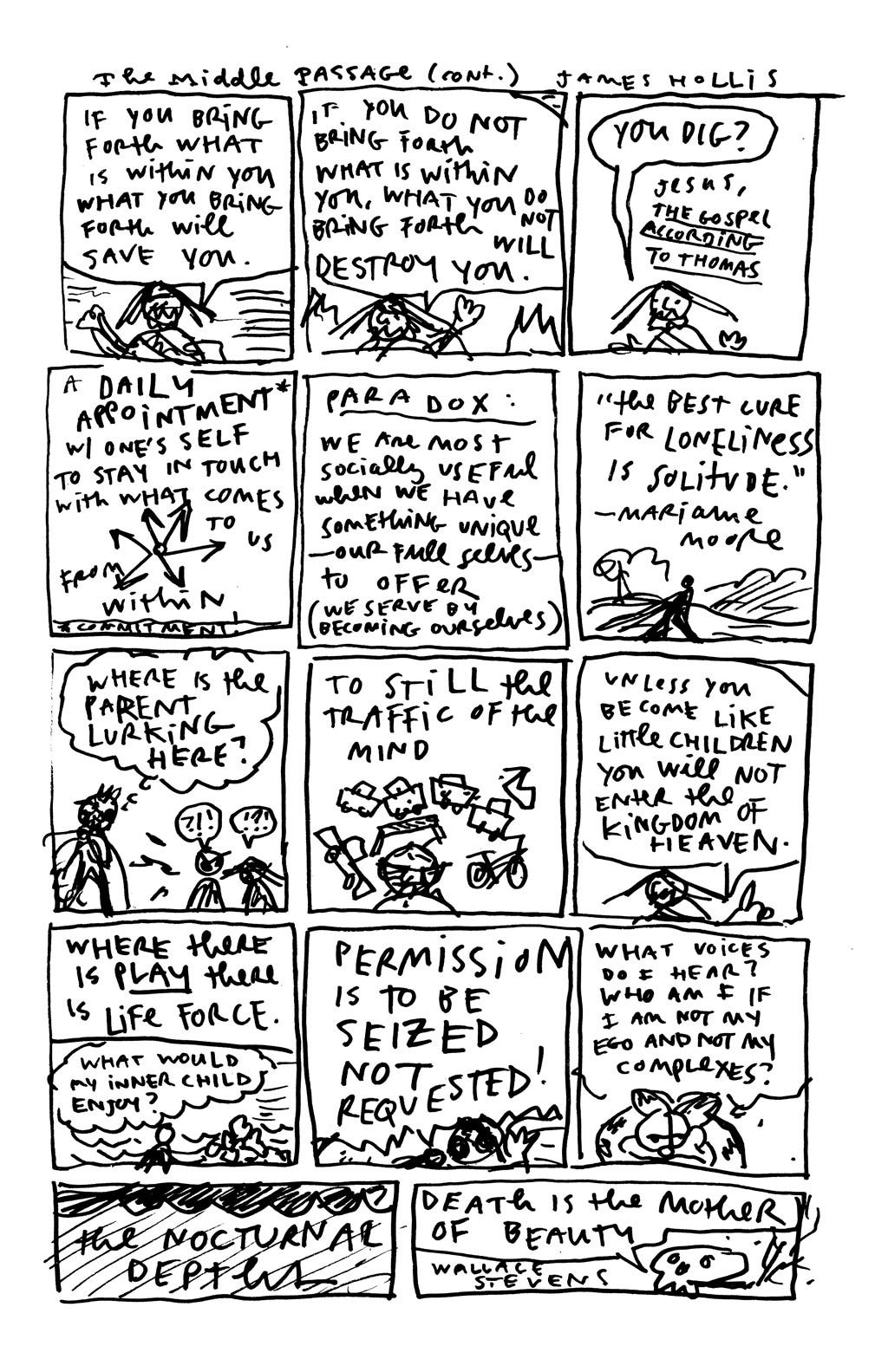 All of this is on my mind because I’ve been re-reading Carl Jung and the work of the Jungian analyst James Hollis. Over the weekend I finished Hollis’s 1993 book, The Middle Passage: From Misery to Meaning in Mid-Life. I knew I was going to like it the minute I saw the epigraphs: