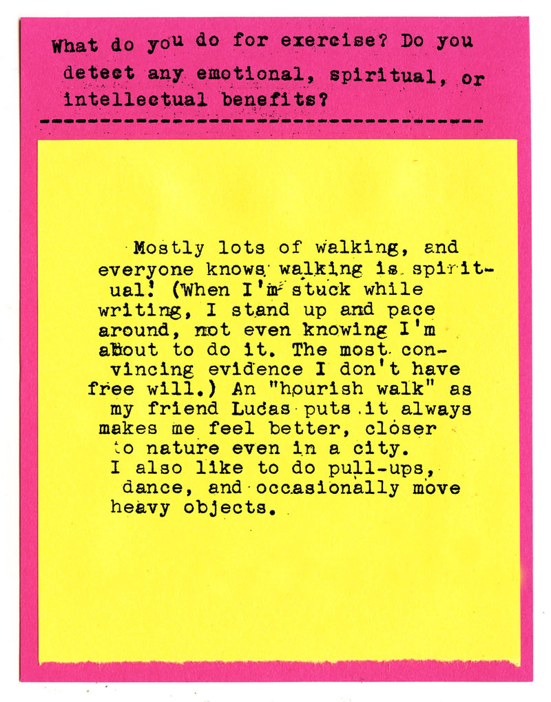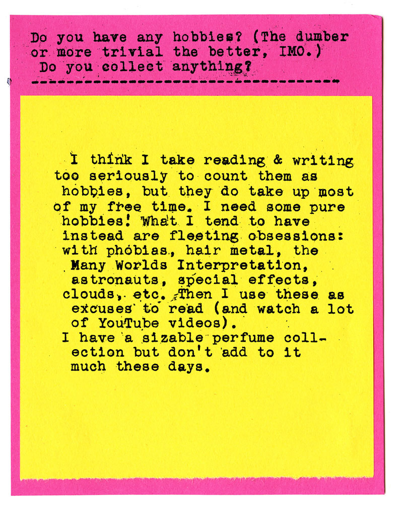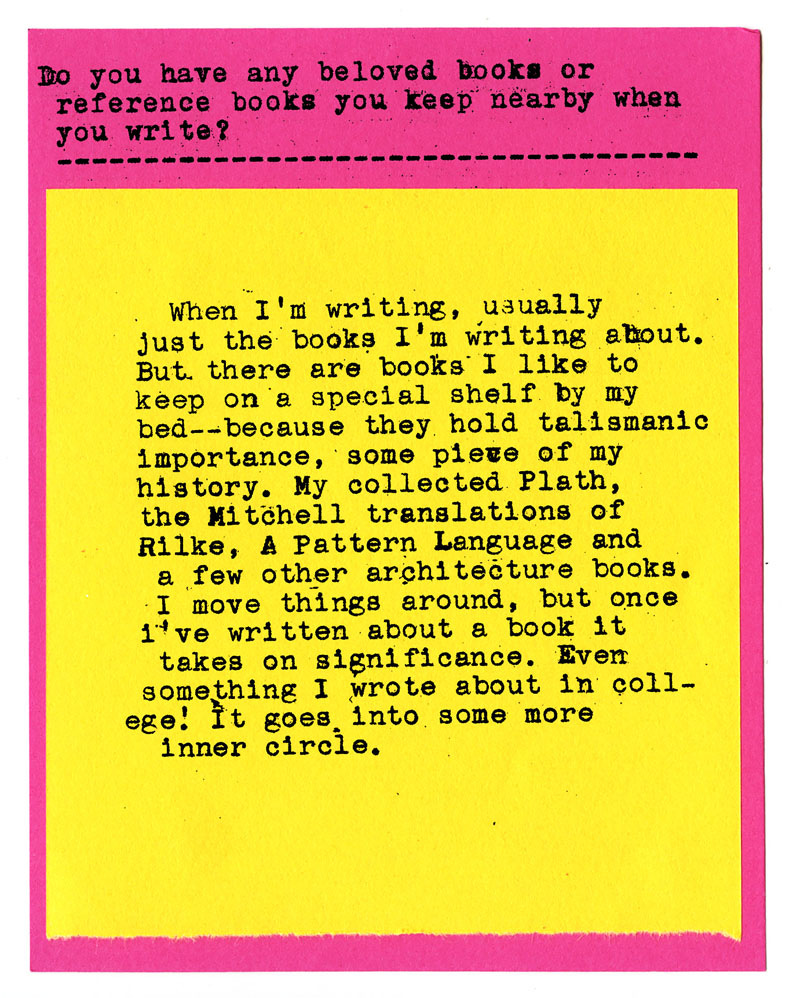 I, too, am a big fan of The Denial of Death. Despite being a native Texan, Elisa only just read Larry McMurtry’s Lonesome Dove this summer. As part of an event series called The Geek-Out, she discussed the novel with her friend Kathleen Rooney, who co-founded the typewriter poetry site Poems While You Wait and lent Elisa a Smith-Corona Skywriter so she could do this interview. (Thanks, Kathleen!)
