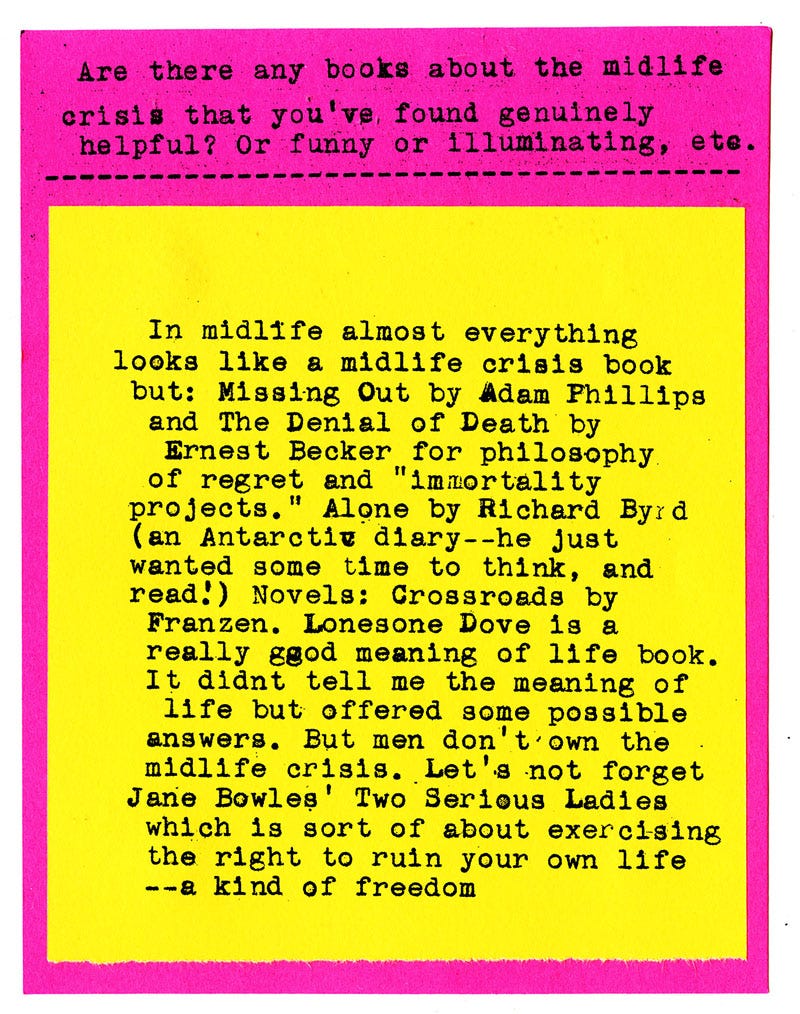 On writing, having interests instead of hobbies, and good midlife crisis books