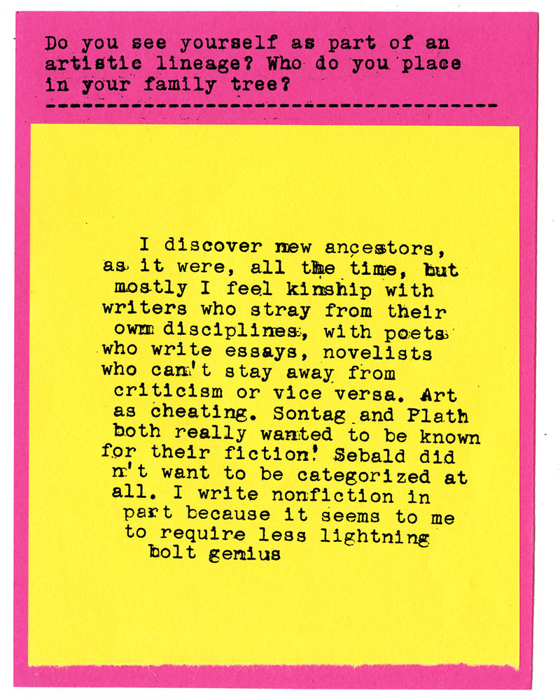 I’m obviously attracted to the same kinds of cross-disciplinary artists — especially writers who draw. (I’ve never been able to get into W.G. Sebald, who uses images in his texts. Elisa told me I should read Vertigo.)