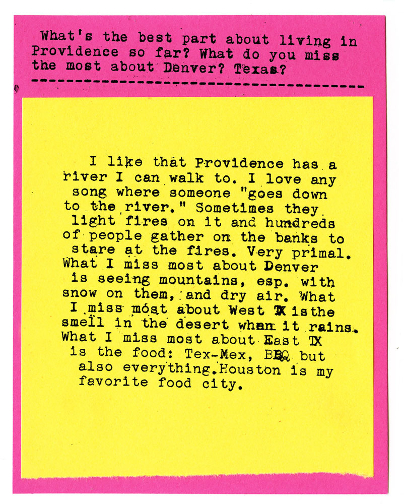“I grew up in El Paso and was so sad when I found that rain doesn’t smell that good anywhere else,” she says. “It’s not just basic petrichor – I think it comes from the creosote.” (She and her husband the writer John Cotter moved to Providence last year after living in Denver.)