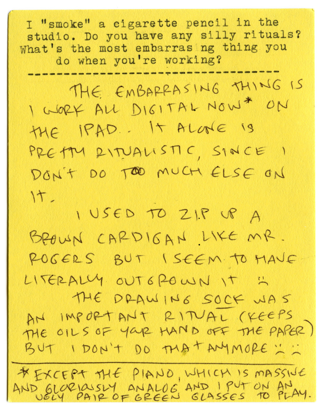 This typewriter interview was conducted via the magic of the United States Postal Service. (For a plain-text version with links, see the P.S. below.)